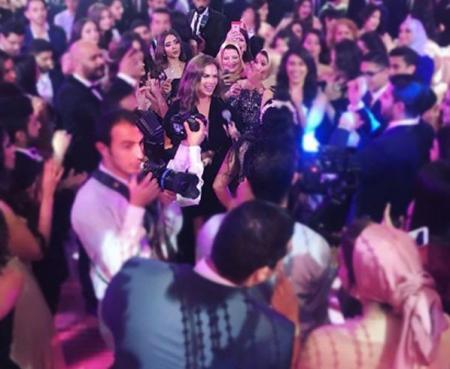 وقامت المطربة اللبنانية بالرقص مع العروسين، مما أشعل الحماس داخل قاعة الزفاف، التى اكتظت برجال الأعمال وعددًا كبيرًا من المدعوين.